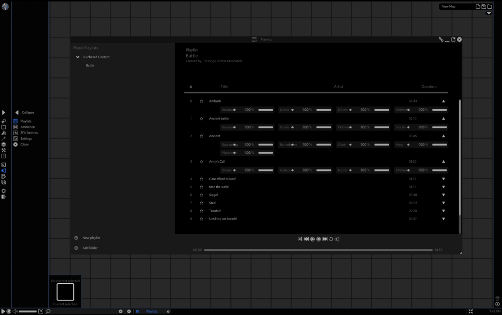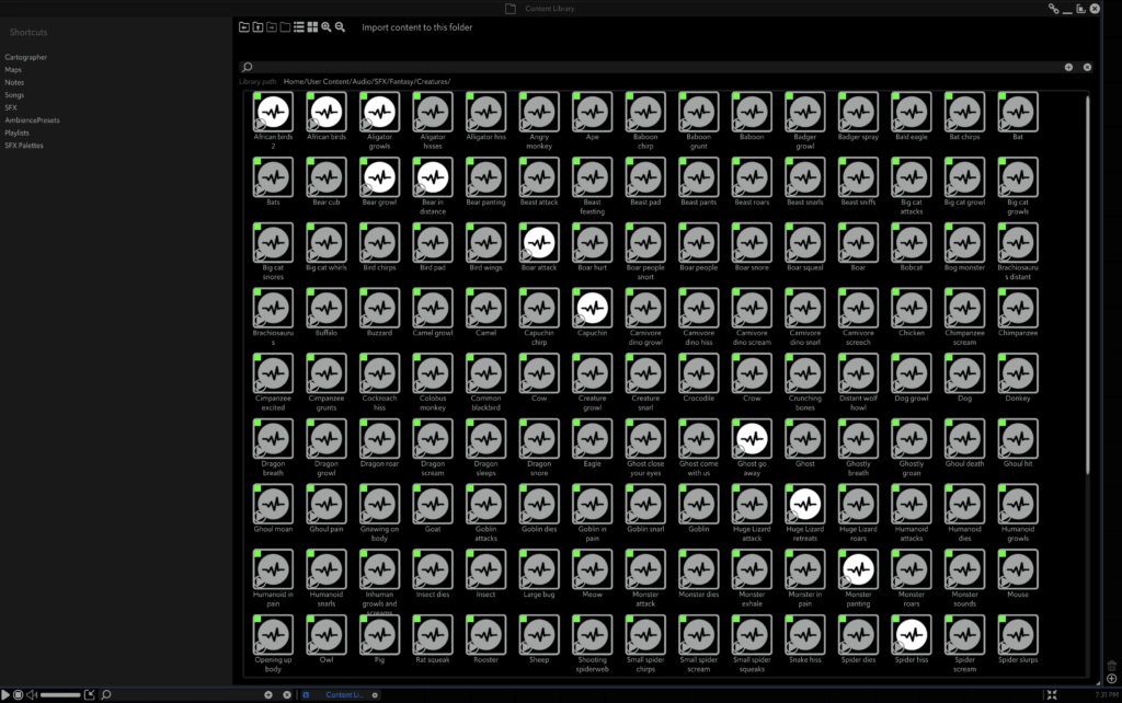 Because our audio content has been bundled into packs until now, we can’t easily build these into audio collections that pull from multiple packs. You may have noticed that we have playlists with names like ‘Battle’, and ‘Battle (Wild)’. There’s no ‘Battle (Towns and Cities)’ because we realised that having the same version of the same playlists in each pack is a bit silly.