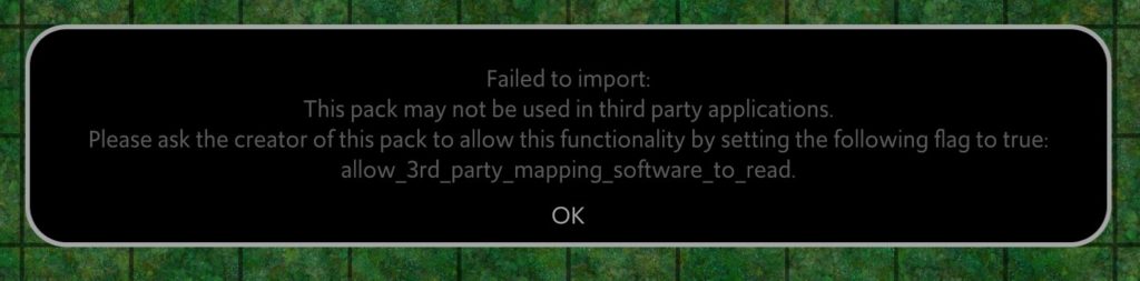 If you have not allowed your pack to be usable in software outside of Dungeondraft, users will see the following message when they try to import it into the Arkenforge Toolkit.
