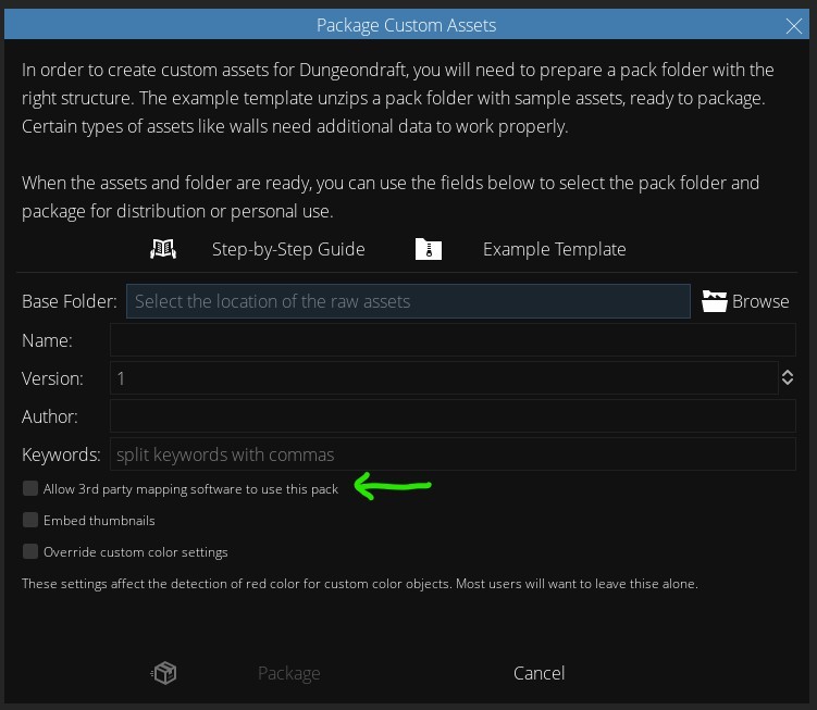 If you’re using Dungeondraft’s own ‘Package custom assets’ feature, you’ll want to enable the ‘Allow 3rd party mapping software to use this pack’ checkbox.
