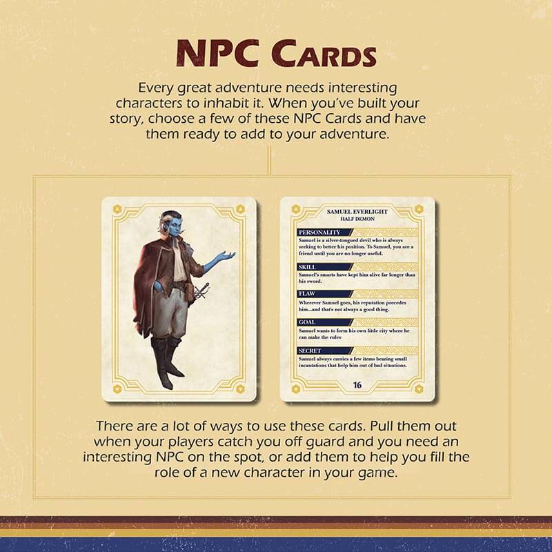 Suggested play: Each card in the Deck of Stories NPC series is titled with the character’s name and 1 or 2. For example, Ahri Rendevier NPC 1. When an NPC is needed, simply locate the two corresponding cards and use the character on the spot!