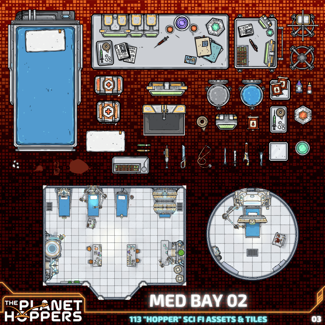 Ahoy Hoppers! Get ready for Liftoff, as we bring you even more medical bay assets for use in your futuristic infirmaries. This includes 7 tiles and 106 themed assets and a DungeonDraft pack, including (but far from limited to!):
